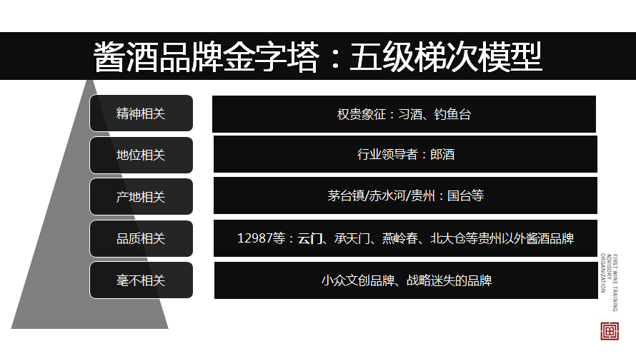 圍繞一個中心,根據(jù)其他醬酒品牌和茅臺在不同層次的相關(guān)性聯(lián)想,我梳理出一套醬酒品牌的五級梯次模型。