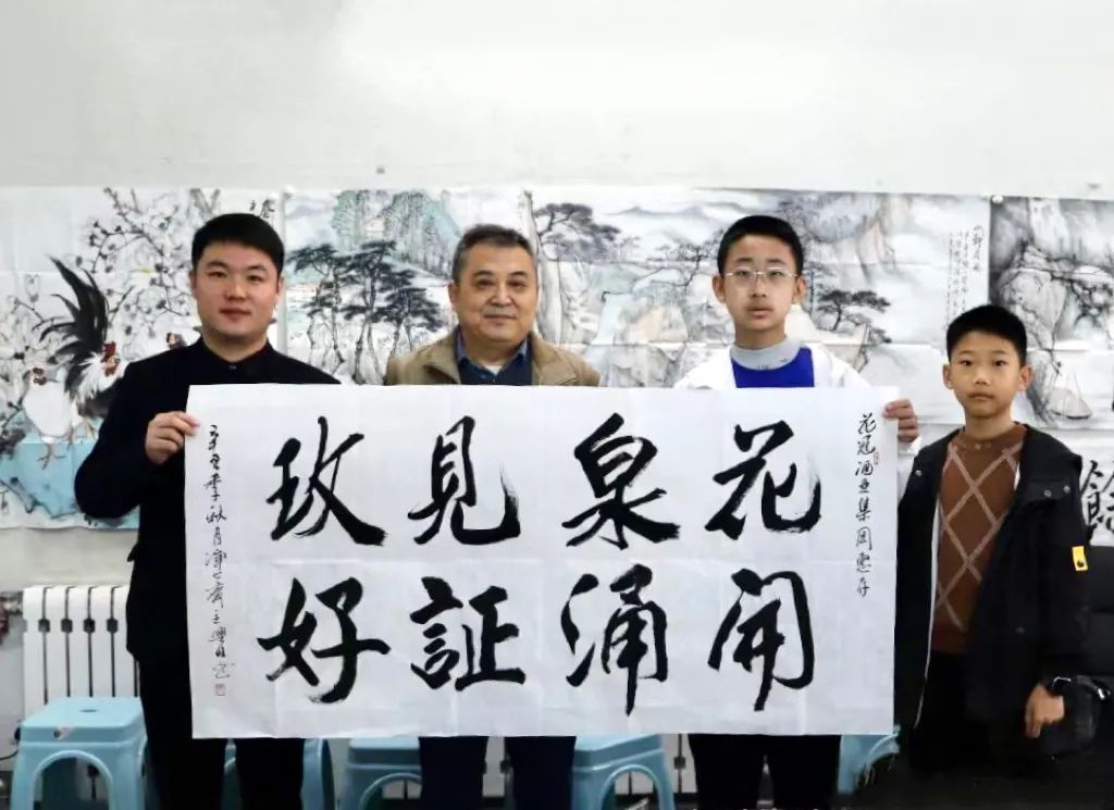 課堂上,從如何開筆,如何落筆,蘸墨薄厚,出筆力道等等,閆老師極具耐心地為大家分享書畫的樂趣。說到興起,閆老師更是為大家現(xiàn)場演示書法創(chuàng)作的過程,揮毫提寫“花開泉涌 見證玫好”,為大家展示書法筆法的用筆技法。