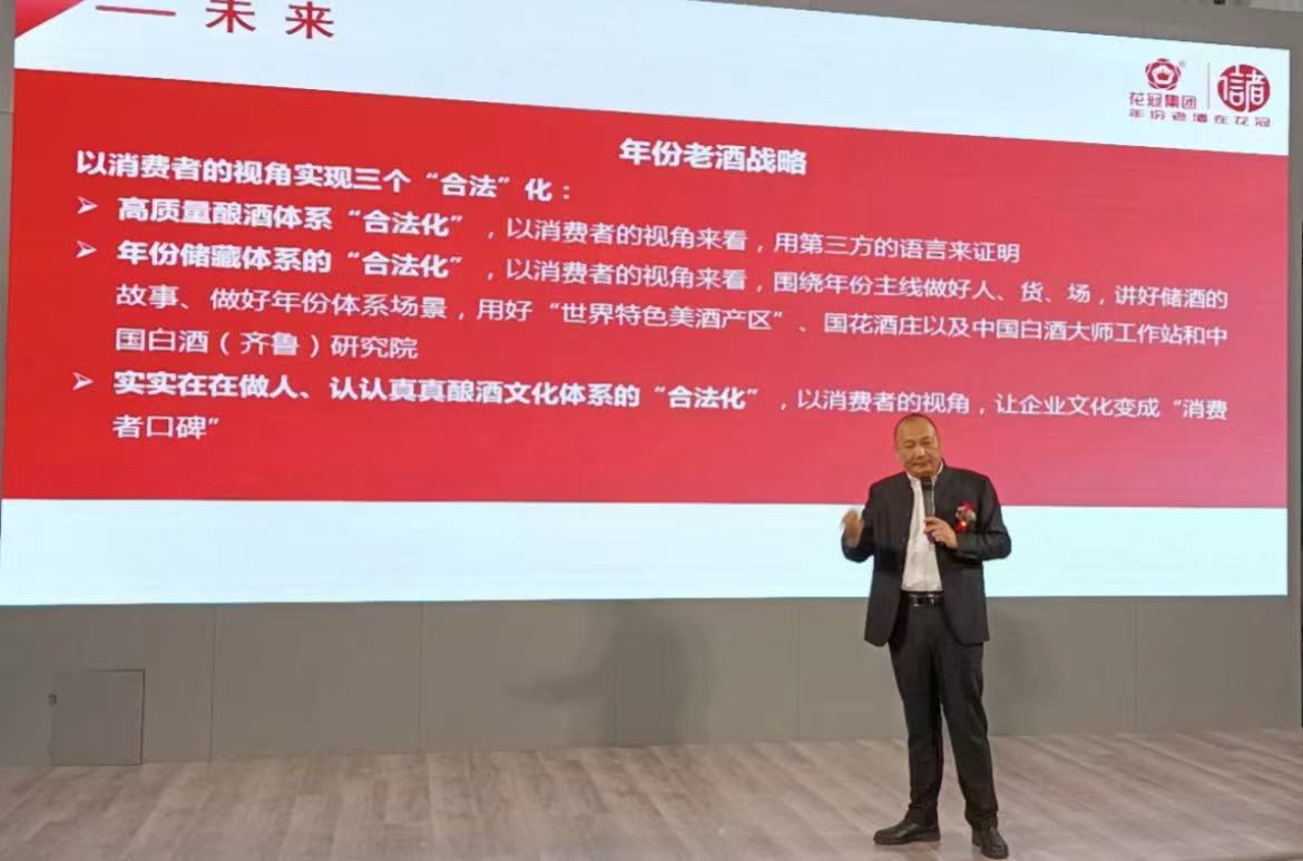 花冠集團(tuán)董事長劉念波先生進(jìn)行《禮敬齊魯大地一杯真實(shí)年份好酒》宣講。劉董事長圍繞二十年儲酒節(jié)回顧和五年戰(zhàn)略規(guī)劃這一主題,按照時間劃分成回望、選擇、未來三個不同階段,逐一做了闡述。他先從蝶變、儲酒、競爭三個維度回望花冠集團(tuán)發(fā)展脈絡(luò),他講道,花冠集團(tuán)自1998年開始,從占地50多畝、600多個窖池、3000噸原酒儲存能力、是山東省幾十個名不見經(jīng)傳的縣級小酒廠之一。到2021年,變成5個濃香型白酒生產(chǎn)企業(yè)、總占地2100多畝、13000個窖池、13萬噸原酒儲存能力、原酒儲存量達(dá)到3.7萬噸,是山東省最大的優(yōu)質(zhì)糧食酒生產(chǎn)與儲存企業(yè)。
