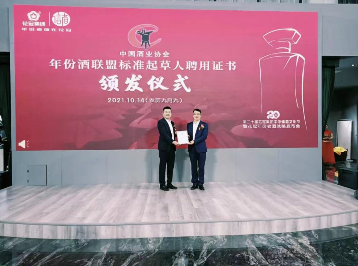 中國酒業(yè)協(xié)會副秘書長劉振國先生向花冠集團(tuán)副總經(jīng)理姚元滋先生頒發(fā)年份酒聯(lián)盟標(biāo)準(zhǔn)起草人聘用證書》